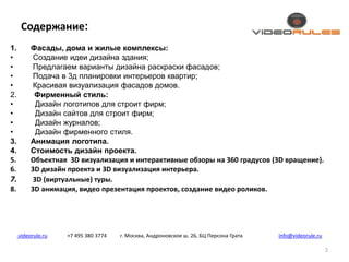 Документ описывает услуги компании по производству графики и 3D-визуализации, включая дизайн фасадов, интерьеров, фирменного стиля и анимацию логотипов. Также представлены различные этапы разработки дизайн-проектов, технические задания и цены на услуги. Компания предлагает индивидуальные решения и 3D-туры, обеспечивая высококачественную визуализацию для жилых и коммерческих объектов.