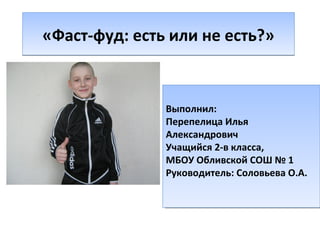 Документ представляет проект Ильи Перепелицы о влиянии фаст-фуда на здоровье человека. Цель проекта - обосновать вред фаст-фуда и обучить школьников выбирать полезные продукты. В проекте анализируются составы фаст-фуда и его влияние на организм, а также предлагаются различные образовательные активности для воспитания осознанности в питании.
