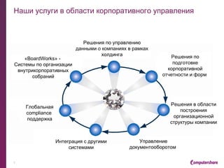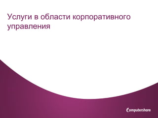 Документ описывает услуги корпоративного консалтинга, предлагаемые компанией Computershare, включая консультирование по вопросам эмиссии и размещения ценных бумаг, а также регулирования инвестиционных фондов. Также представлены аспекты раскрытия информации, корпоративного управления и операций с ценными бумагами. В итоговой части указаны контакты ключевых специалистов компании.