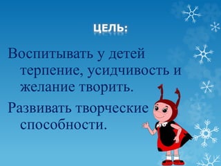 Документ описывает творческую поделку, выполняемую детьми средней группы детского сада, с целью развить у них терпение и творческие способности. Изготовленная из пластиковых бутылок, она может служить украшением новогоднего интерьера или подарком. Участники проекта стремятся удивить других своей работой и внести радость в празднование.