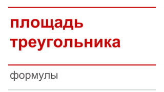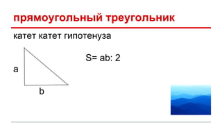 Документ содержит информацию о формуле для вычисления площади треугольника, включая прямоугольный треугольник. Упоминаются катеты и гипотенуза, а также формула для нахождения площади через две стороны и угол между ними. Предлагается использовать формулу для случаев, когда известны две стороны и угол.
