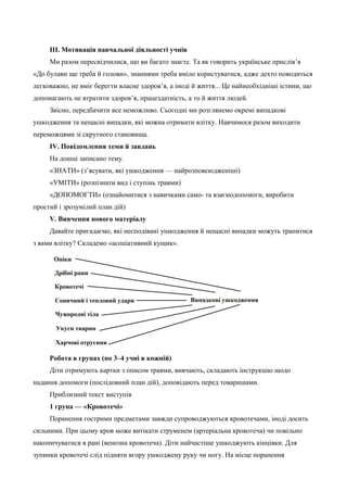 Діти отримують картки з описом травми, вивчають, складають інструкцію щодо