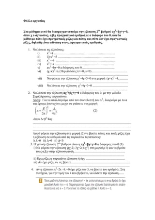 Στομάθημα αυτό θα διαπραγματευτούμε την εξίσωση 2ου βαθμού αχ2+βχ+γ=0, όπου χ ο άγνωστος, α,β,γ πραγματικοί αριθμοί με α διάφορο του 0, και θα μάθουμε πότε έχει πραγματικές ρίζες και πόσες και πότε δεν έχει πραγματικές ρίζες, δηλαδή είναι αδύνατη στους πραγματικούς αριθμούς.