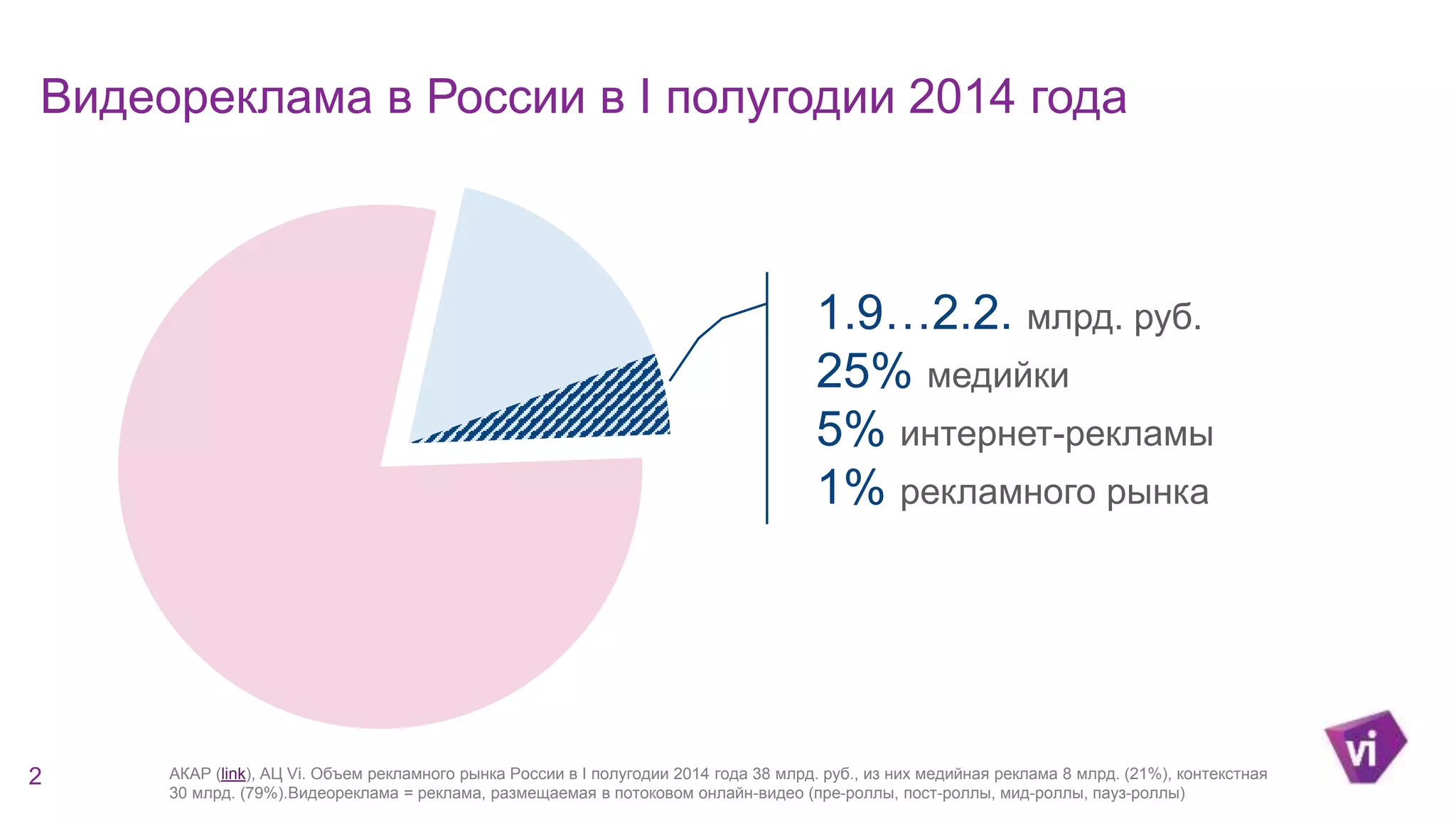 Документ предоставляет анализ состояния видеорекламы в России за первое полугодие 2014 года, включая данные о росте рекламного рынка и изменении предпочтений пользователей к мобильным устройствам. Видеореклама составляет значительную долю медиарекламы, с ростом пользователей онлайн-видео и увеличением их активности. Прогнозируется дальнейший рост аудитории видеоресурсов, особенно среди недесктопных пользователей.