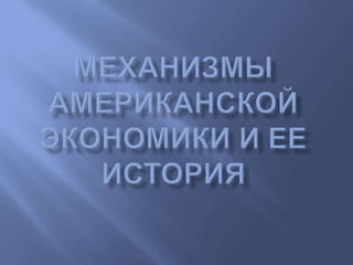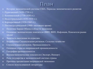 Документ охватывает историю экономической системы США, описывая основные периоды развития с 1620 года до наших дней, включая пуританский, колониальный, индустриальный, корпоративный и постиндустриальный этапы. Рассматриваются важные экономические показатели, такие как ВВП, уровень безработицы и инфляция, а также роль государства в экономике и влияние политики различных президентов. Документ также анализирует современные тенденции, включая развитие малого бизнеса и налоговую политику Обамы, а также проблемы бюджета и государственного долга.