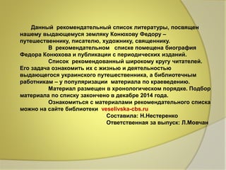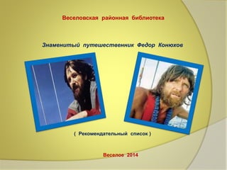 Документ представляет собой рекомендательный список литературы о выдающемся украинском путешественнике Федоре Конюхове, включающий его биографию и публикации о его деятельности. Он создан для ознакомления читателей с жизнью Конюхова и также служит ресурсом для библиотечных работников в области краеведения. Список завершен в декабре 2014 года и размещен в хронологическом порядке на сайте библиотеки.