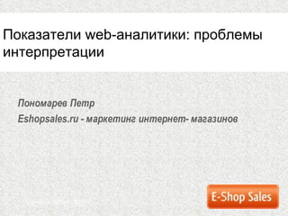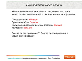 Документ обсуждает важные аспекты маркетинга интернет-магазинов и проблемы интерпретации показателей веб-аналитики. Автор подчеркивает, что высокая посещаемость не всегда приводит к увеличению продаж и предлагает переосмыслить основные маркетинговые метрики. Рекомендуется ставить конкретные цели и использовать реальные данные для анализа, чтобы улучшить результаты продаж.