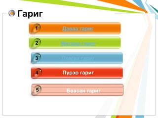 гариг 2 Мягмар гариг 3 Лхагва гариг 4 Пүрэв гариг 5 Баасан гариг