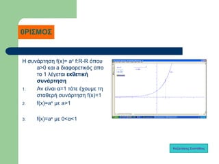 εκθετικη συναρτηση 1. 2. Η συνάρτηση f(x)= ax f:R-R όπου a>0 και a διαφορετικός απο το 1 λέγεται εκθετική συνάρτηση