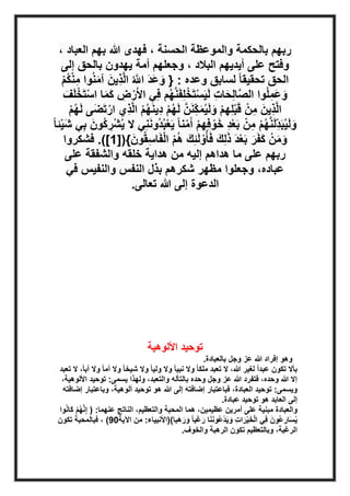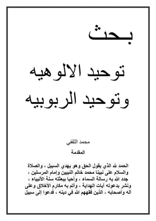 تناقش الوثيقة مفهوم توحيد الألوهية وتوحيد الربوبية في الدين الإسلامي، موضحة أهمية إفراد الله عز وجل بالعبادة واعتراف جميع المسلمين بهذه الأنواع من التوحيد. تقدم الوثيقة أدلة مستندة إلى القرآن والسنة على تفرد الله سبحانه وتعالى بالألوهية وترد على المفاهيم الخاطئة التي تدعي ألوهية غيره. كما تبرز أهمية العبادة القائمة على الحب والتعظيم لله وحده.
