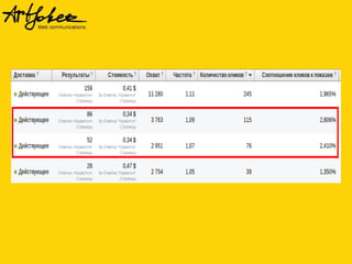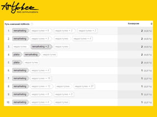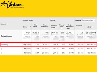 Документ представляет мастер-класс по ремаркетингу, освещая процессы создания рекламных кампаний в Google, настройки ремаркетинга и повышения его эффективности. Рассматриваются виды ремаркетинга, включая динамический и поисковой, а также важность использования уникальных торговых предложений и призывов к действию в рекламных объявлениях. Также обсуждаются возможности ремаркетинга в социальных сетях и методы измерения его успеха.