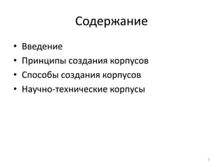 Документ описывает основные принципы создания языковых корпусов и их использование в лингвистических исследованиях. Описаны типы корпусов, такие как письменные и устные, а также примеры крупнейших корпусов, включая Британский национальный корпус и Национальный корпус русского языка. Также рассматриваются методы создания корпусов и их роль в автоматической обработке текстов и лексических исследований.