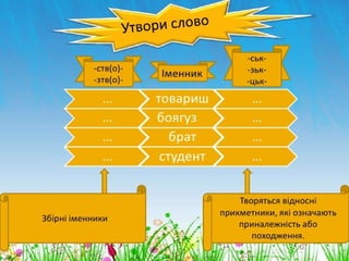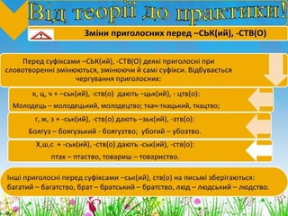 допомогою суфіксів -ськ(ий), -ств(о), де це