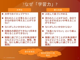 ・海外進出事業の増加というだけではない ・企業が求める能力を持った人員が、日本人よりも外国人に多い ・日本の本社で勤務する外人新入社員が増加していく ・日本の企業の中核も外人新入社員から育った人が多くなる 「自分で自分を成長させていける人が必要とされている!」 大学生に「学習力」を持たせましょう