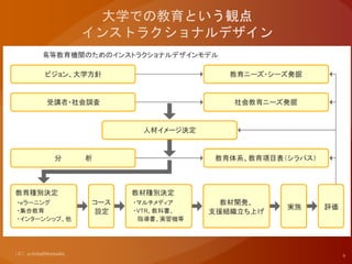 適用 Learning Based Society 技能 習得 知識 獲得 態度修得 行動変容 狭義の学習 問題 ニーズ 学 習 す る 目 的 明 確 化 分 析 解 決 新たな 問題 ニーズ 実 行 結果 個人、組織、社会 設 計 開 発 活 用 効 果 評価 ニーズ、問題を より掘り下げた 再分析 自己の 成長 社会の 発展 組織の 繁栄