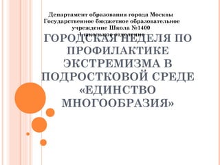 Неделя по профилактике экстремизма в подростковой среде «единство многообразия» в ГБОУ школа №1400 прошла с 10 по 14 ноября 2014 года с участием 238 учащихся и 9 классных руководителей. В программе недели были акции, круглые столы и демонстрации видеофильмов, направленные на развитие терпимости и понимания среди учащихся. Подведение итогов мероприятия включало награждение активных участников и подготовку отчетной презентации.