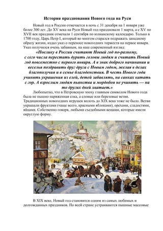 История празднования Нового года в России насчитывает более 300 лет, начиная с 1 марта и далее переходя на 1 сентября, прежде чем царем Петром I в 1700 году был издан указ о праздновании 1 января. В советский период, после запрета празднования, Новый год вновь обрел популярность с 1935 года, когда вернулись традиции, такие как наряжание елки и приготовление традиционных блюд. Праздник включает различные символы и обычаи, которые варьируются в зависимости от страны, что подчеркивает разнообразие новогодних традиций по всему миру.