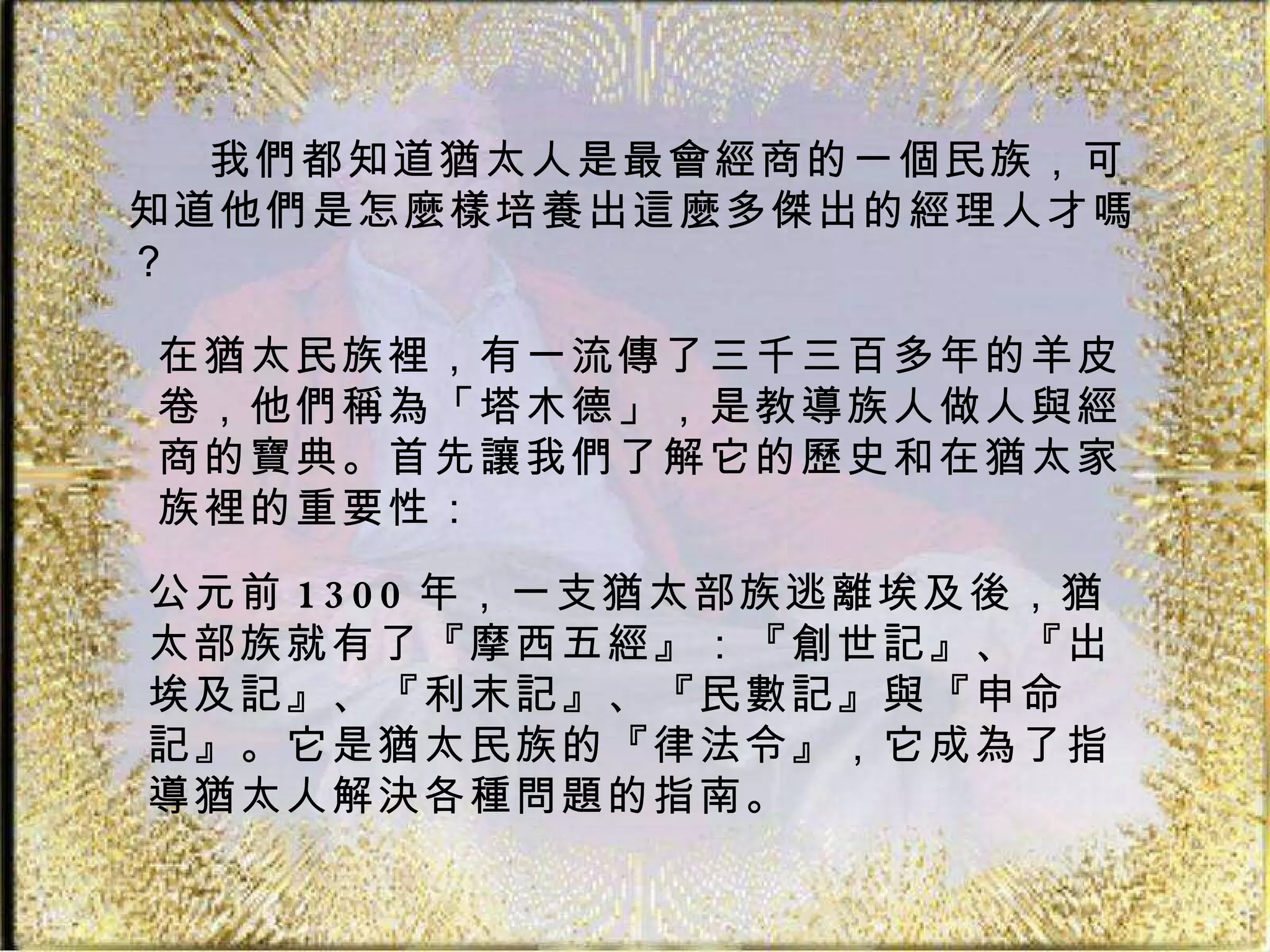 《塔木德》是一部具有三千三百多年历史的犹太教经典,涵盖了犹太民族的法律、道德和经济智慧的重要内容。它通过对犹太历史、文化与智慧的深入探讨,为犹太人提供解决生活问题的指导原则和思想。该书的价值在于它为犹太民族在苦难中生存提供了精神支柱,强调自我修养、团结和教育的重要性。