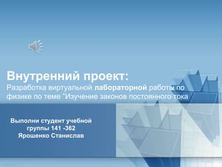 Документ представляет проект по разработке виртуальной лабораторной работы по физике, посвященной изучению законов постоянного тока для студентов и учителей университета машиностроения. Основная цель лабораторной работы заключается в определении сопротивления проводников и проверке закона Ома с использованием среды программирования LabVIEW. Проект адресован как действующим студентам, так и абитуриентам.
