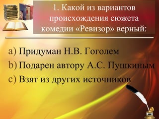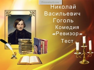 Документ содержит тестовые вопросы и ответы о комедии Н. В. Гоголя "Ревизор", касающиеся её сюжета, персонажей и авторских замыслов. Вопросы охватывают аспекты комедии, такие как происхождение сюжета, дата премьерного показа, характеристики героев и виды комического жанра. Ответы к вопросам предоставляют информацию о понимании произведения и его персонажей.