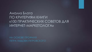 Документ представляет собой анализ блога Петра Лидова-Петровского, основанный на критериям из книги «100 практических советов для интернет-маркетолога». Рекомендовано публиковать обзоры интересных публикаций и проводить вебинары, однако многие рекомендации не реализованы в блоге, и информация представлена в основном на Facebook. Отмечены отсутствия информации о современных тенденциях и исследованиях в блоге.