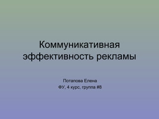 Документ обсуждает коммуникативную и экономическую эффективность рекламы, подчеркивая их взаимосвязь и влияние на потребительские решения. Он рассматривает модели коммуникации и их влияние на восприятие рекламы, приводя примеры исследований и теорий, таких как двухступенчатая модель, диффузная теория и различные иерархические модели эффектов. Также рассматриваются критерии оценки коммуникативной эффективности, такие как запоминаемость и распознаваемость рекламы.