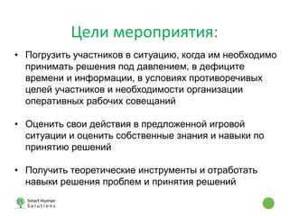 Документ описывает мероприятие, целью которого является обучение участников навыкам принятия решений в условиях давления и дефицита информации через игру '100 минут до катастрофы'. Игроки должны совместно найти решение проблемы остановки неуправляемого поезда, что позволяет им исследовать свои знания и стратегии принятия решений. Обсуждение теоретических основ и тренинг по решению проблем завершают мероприятие, предоставляя участникам инструменты и методы для эффективного решения задач.