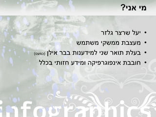 יעל •משתמש ממשקי מעצבת •אילן בבר למידענות שני תואר בעלת(כמעט) •בכלל חזותי ומידע אינפוגרפיקה חובבת
