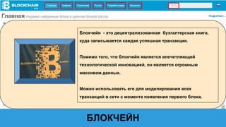 Документ описывает блокчейн как децентрализованную бухгалтерскую книгу для записи транзакций и содержит множество аналитических данных о сети Bitcoin. Представлены различные категории транзакций, такие как самые большие, неподтвержденные и странные транзакции, а также статистика по майнинг-пулам и узлам сети. Также указаны функции и инструменты для анализа и управления биткойнами через онлайн-кошелек.