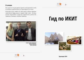 Гид по ИКИТ Красноярск 2014 создан для студентов и гостей института, предоставляя информацию о расположении учебных аудиторий, кафедр, деканата, а также о удобствах, таких как lounge-зоны и покрытие wi-fi. Институт был основан в 2007 году, и в нем работает более 200 преподавателей, среди которых 30 докторов наук. В документе также описаны различные этажи здания и оснащение аудиторий современными технологиями.