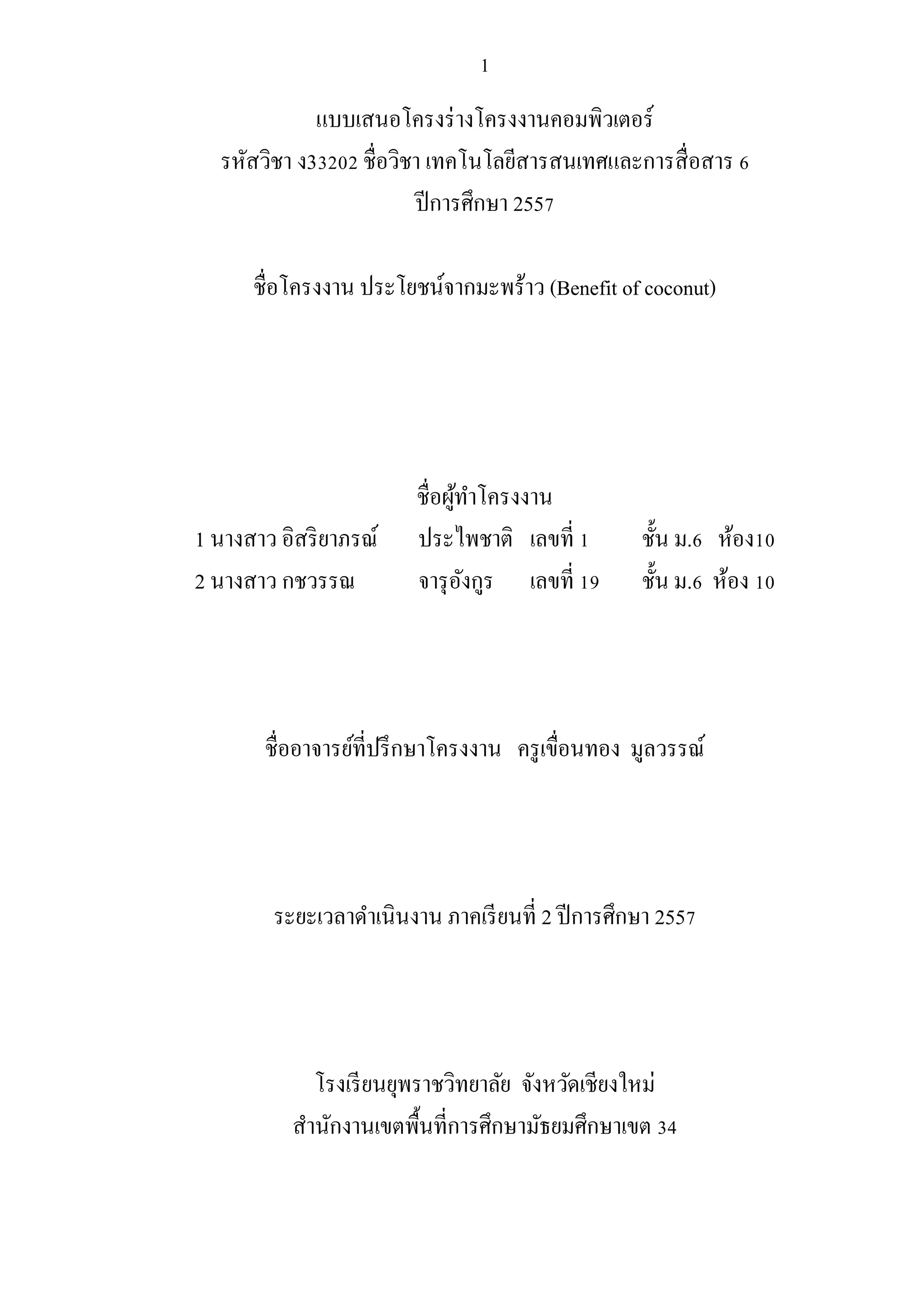 เทคโนโลยีสารสนเทศและการสื่อสาร 6 ปีการศึกษา 2557 ชื่อโครงงาน ประโยชน์จากมะพร้าว (Benefit of coconut) ชื่อผู้ทาโครงงาน 1 นางสาว อิสริยาภรณ์ ประไพชาติ เลขที่ 1 ชั้น ม.6 ห้อง10 2 นางสาว กชวรรณ จารุอังกูร เลขที่ 19 ชั้น ม.6 ห้อง 10 ชื่ออาจารย์ที่ปรึกษาโครงงาน ครูเขื่อนทอง มูลวรรณ์ ระยะเวลาดาเนินงาน ภาคเรียนที่ 2 ปีการศึกษา 2557 โรงเรียนยุพราชวิทยาลัย จังหวัดเชียงใหม่ สานักงานเขตพื้นที่การศึกษามัธยมศึกษาเขต 34