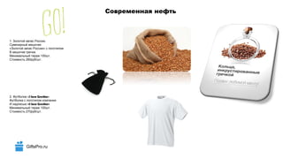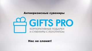 Документ описывает ассортимент антикризисных сувениров, предлагаемых на сайте giftspro.ru, включая товары с логотипами и уникальными дизайнами. Каждое предложение содержит информацию о минимальном тираже и стоимости, варьирующейся от 40 до 500 рублей за единицу. Включены также контактные данные для заказа и дополнительной информации.