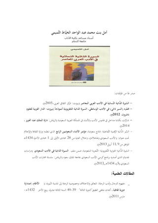 يتناول المستند مجموعة من المؤلفات والأبحاث التي تتعلق بالأدب العربي المعاصر، مع التركيز على السيرة الذاتية والأدب الرقمي. يتضمن قائمة من الكتب والمقالات التي أصدرتها شخصيات أكاديمية وثقافية في المملكة العربية السعودية. كما يشير إلى المؤتمرات والدوريات التي تعنى بالنقد الأدبي والتفاعل الثقافي في السياق السعودي.