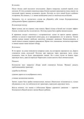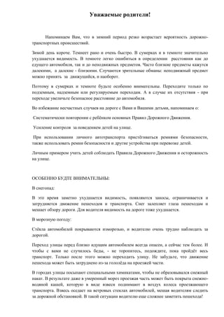 Документ напоминает родителям об опасностях дорожного движения зимой, когда ухудшается видимость и возникают трудности с определением расстояния до автомобилей. Указаны меры предосторожности, такие как соблюдение правил дорожного движения, использование ремней безопасности и особая внимательность в сложных погодных условиях. Подчёркивается важность систематического обучения детей правилам безопасности на дороге.