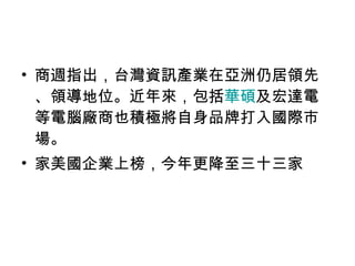 十八家台灣資訊科技廠商入選美國《商業週刊》評選的全球百大資訊科技企業,顯示台灣在全球市場的競爭力。這些公司包括華碩和宏達電等,反映了台灣在資訊產業的領導地位。報告指出,亞洲企業的盛行程度逐漸上升,台灣在亞洲排名最高。