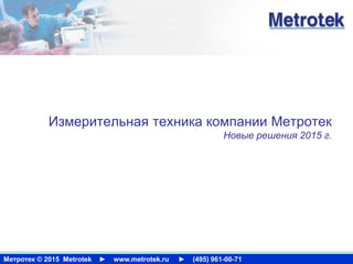 Документ представляет новые решения в области измерительной техники компании Метротек за 2015 год, включая разработку линии продуктов для диагностики волоконно-оптических сетей в сотрудничестве с Agizer. В документе описываются различные модели оптических рефлектометров и анализаторов спектра, их характеристики и применения, а также упоминается первый заказчик — Ростелеком. Также освещены функции устройств, включая интеграцию с облачными сервисами для анализа данных.