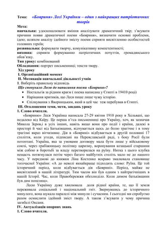 Тема: «Бояриня» ЛесіУкраїнки – один з найкращих патріотичних творів Мета: навчальна: удосконалювати вміння аналізувати драматичний твір; з’ясувати причини появи драматичної поеми «Бояриня», визначити основні проблеми, ідею; шляхом аналізу ідейного змісту поеми сприяти висвітленню особистостей головних героїв; розвивальна: формувати творчу, комунікативну компетентності; виховна: сприяти формуванню патріотичних почуттів, громадянського обов’язку. Тип уроку: комбінований Обладнання: портрет письменниці; тексти твору. Хід уроку І. Організаційний момент ІІ. Мотивація навчальної діяльності учнів 1. Виберіть правильну відповідь Що спонукало Лесю до написання поеми «Бояриня»? • Ностальгія за рідним краєм ( поема написана у Єгипті в 19410 році) • Нарікання критиків, що Леся пише лише чужу історію. • Спілкування з Яворницьким, який в цей час теж перебував в Єгипті. ІІІ. Оголошення теми, мети, завдань уроку 1. Слово вчителя. «Бояриню» Леся Українка написала 27-29 квітня 1910 року в Хельвапі, що недалеко від Каїру. Це перша п’єса письменниці про Україну, хоч, як зазначав Микола Зеров,і в усіх інших, навіть якщо вони про події і країни, далекі в просторі й часі від Батьківщини, відчувається щось до болю трагічне і в тому трагізмі якраз вітчизняне. Дія в «Боярині» відбувається в другій половині 17 століття, коли угоди, підписані на Переяславській раді, з боку Росії були потоптані. Україна, яка за умовами договору мала бути лише у військовому союзі, через грабіжницьку політику царизму, воронування козацької старшини між собою в боротьбі за владу перетворилася на руїну. Нитка з цього клубка нещасть потягнулася потім через багато майбутніх століть мало не до нашого часу. У передмові до книжки Ліна Костенко яскраво змалювала становище тогочасної України: «А до неволі якнайкраще підходить слово: Руїна. Це той історичний період, коли відбувається дія «Боярині». Період, майже не висвітлений в нашій літературі. Тим часом він був одним з найтрагічніших в нашій Історії. Час, коли Правобережжя обезлюділо. Коли димом батьківщини був дим попелищ». Лесю Українку дуже хвилювала доля рідної країни, те, що її земля переживала соціальний і національний гніт. Звернувшись до історичного минулого, вона шукала паралелі між минули і сучасним. І сьогодні ми спробуємо разом осмислити ідейний зміст твору. А також з’ясувати у чому причина загибелі Оксани. ІV. Актуалізація опорних знань 1. Слово вчителя.