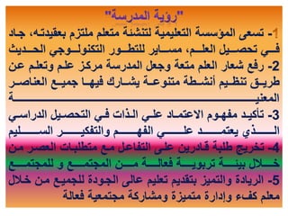 تسعى المؤسسة التعليمية إلى تنشئة متعلمين ملتزمين وتحقيق المتعة في العلم من خلال تمييز التعليم وتطوير بيئة تعليمية فعالة. كما تسهم في تخريج مهنيين ذوي كفاءة وقدرة على التأثير في مجالات تخصصهم. التركيز على تقديم تعليم متميز يعزز من تطوير قدرات المعلمين ويساعدهم في تحقيق أهدافهم.