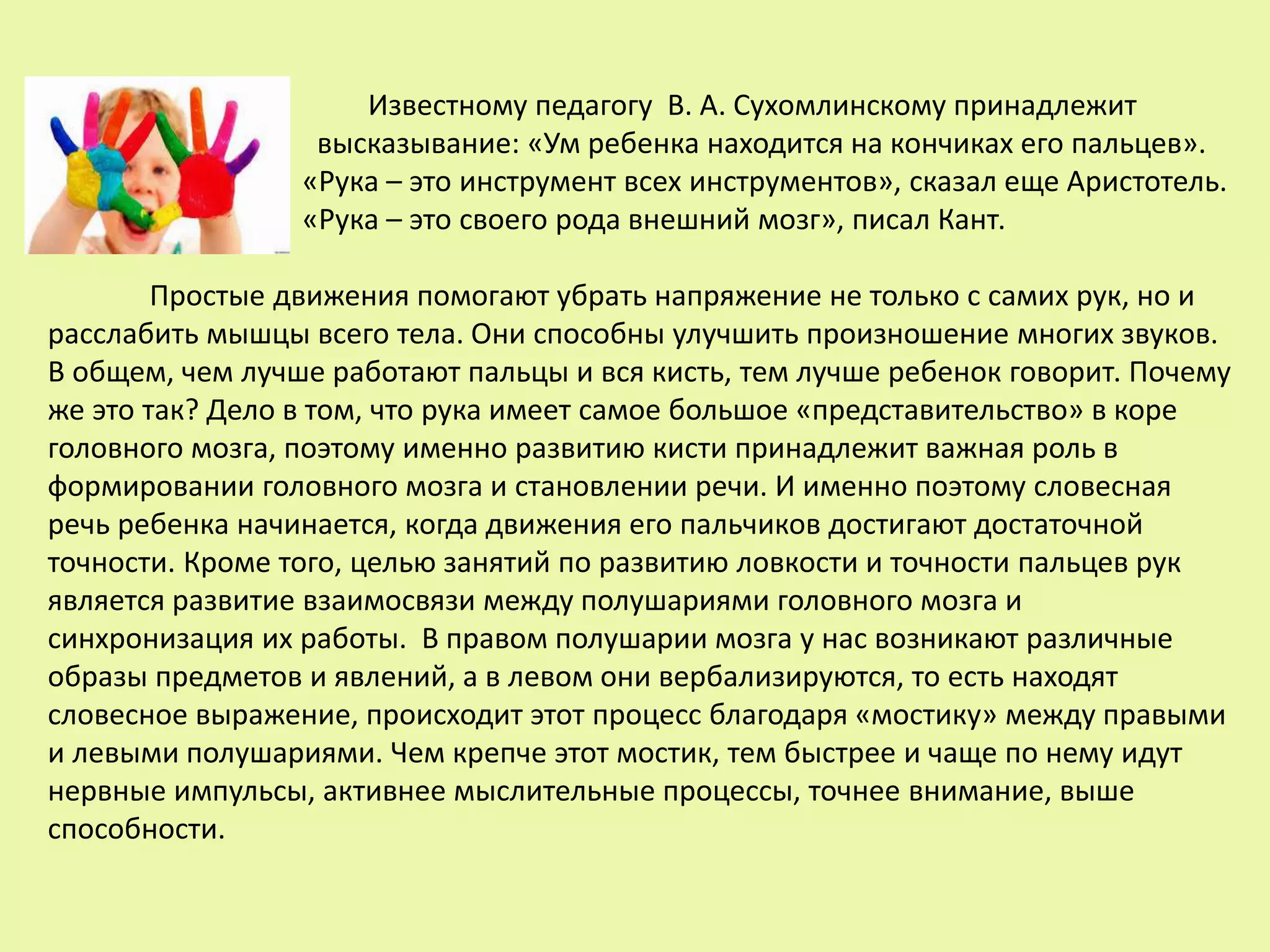 Документ описывает важность развития мелкой моторики у детей, подчеркивая связи между движениями рук и развитием речи и когнитивных функций. Пальчиковые игры и упражнения являются необходимыми для подготовки рук к письму и стимулирования вербальных способностей. Рекомендуются занятия с учетом возраста ребенка и активное участие родителей в процессе.