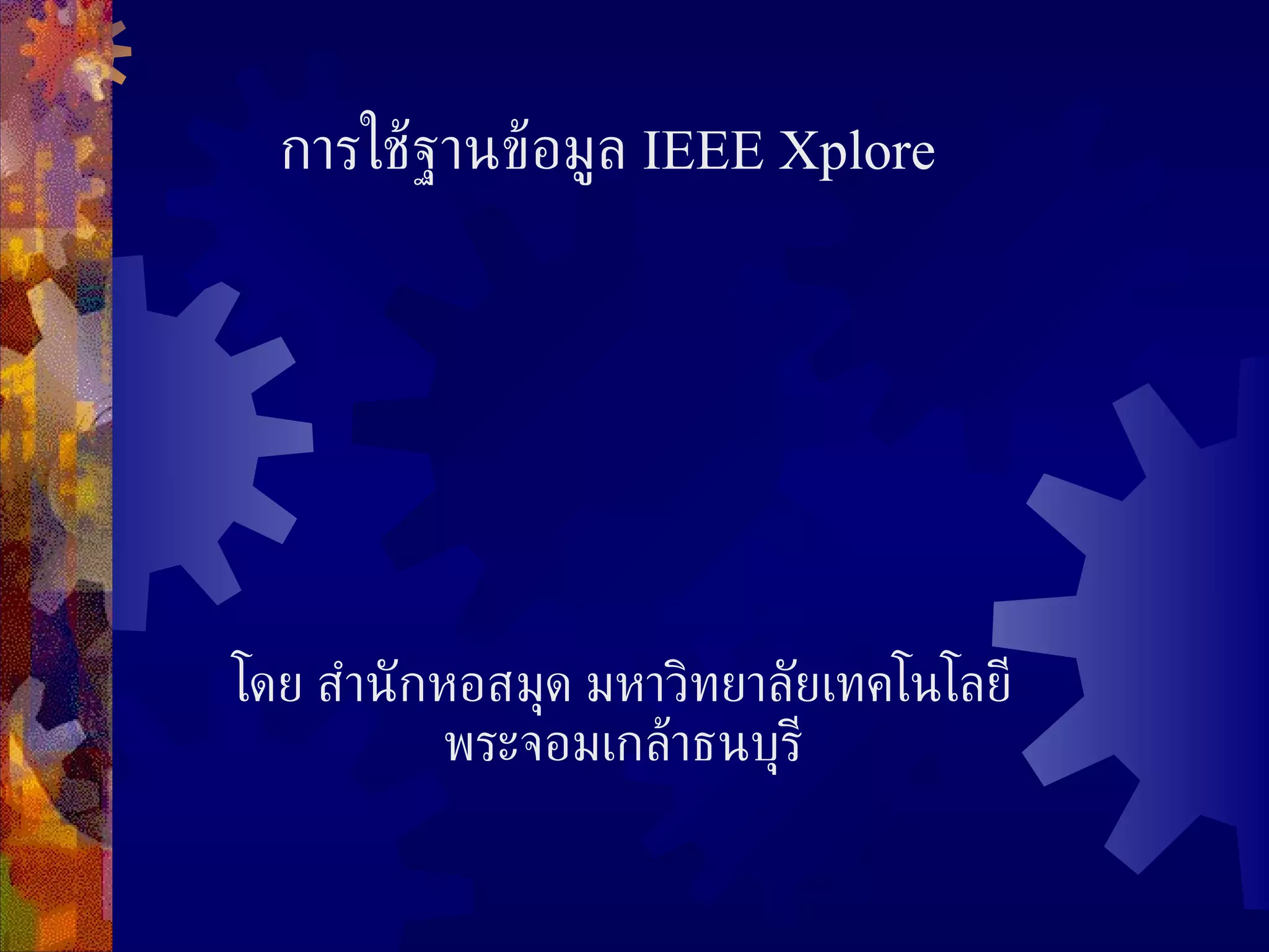 มารู้จักกับ IEEEXplore เป็นฐานข้อมูลเอกสารฉบับเต็มของสิ่งพิมพ์สาขา วิศวกรรมไฟฟ้า อิเล็กทรอนิกส์ และสาขาที่เกี่ยวข้อง ที่จัดพิมพ์โดย The Institute of Electrical and Electronics Engineers (IEEE) และ The Institution of electrical Engineers (IEEE) ซึ่งมีจำนวนมากกว่า 1,008 ,0 86 รายการ ได้แก่ วารสาร รายงานการประชุม และเอกสารมาตรฐาน มีการเพิ่มข้อมูลใหม่ ประมาณเดือนละ 25,000 หน้า มารู้จักกับ IEEE Xplore Main Menu