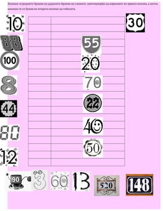 Запиши ги реднитеброеви на дадените броеви во сликите, започнувајќи од најмалиот во првата колона, а потоа