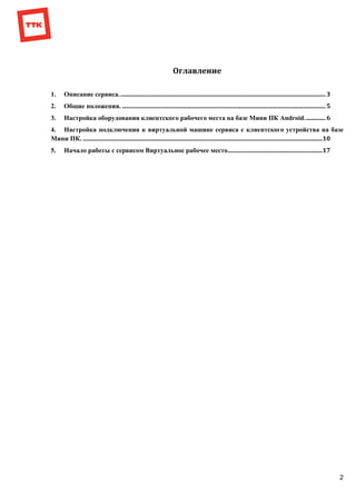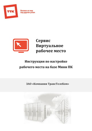 Документ представляет собой инструкцию по настройке виртуального рабочего места на базе мини ПК от компании Транстелеком. В нем описываются особенности сервиса, оборудование, необходимое для работы, а также порядок подключения к виртуальной машине через RDP-клиент. Также приведены конфигурации и тарифы на услуги, а также контактная информация для технической поддержки.