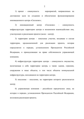 Документ представляет собой проект федерального закона, регулирующего создание и функционирование инновационного центра «Сколково» в России, охватывающий нормы, касающиеся отношений между участниками проекта, а также описание прав и обязанностей управляющей компании. В нем установлены основные определения, связанные с проектом, а также условия аренды и использования инфраструктуры центра. Также описываются особенности деятельности лиц, участвующих в проекте, и порядок их контроля со стороны управляющей компании.