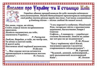 http://svitliteraturu.ucoz.ua/board/pozaklasna_robota/zarubizhni_pismenniki_i_ukrajina/11-1-0-218 1 Україна здавнаприваблювала до себе митців світового письменництва. Нашій батьківщині присвячували найкращі свої рядки поети різних країн та епох. І всі вони зливаються у дзвінку пісню — пісню любові до нашої землі. Ось вона, горда, як пісня, Стоїть переді мною незрівнянною красунею. Дозволь надивитись на тебе, знаменита Україно... Р. Рискулов Люблю, Вкраїно, я тебе, як матір син. Ти вічно в пам'яті моїй, В житті моїм Нестимеш пісні чарівної весноплин. П.Целан "... Мое сердце всегда останется привязанным к священным местам родины". Н. Гоголь "І ось нарешті я побачив. Північний Рим, татарське місто з трьомастами церквами, багатствами Лаври і Святою Софією... А навкруги — українське степове безмежжя. Зовсім не зайве ще хоч раз на це подивитися". P. M. Рільке "Був у чарівному місті Києві, милувався красою і величчю старовинного гнізда руського". М. Горький "Чудовий, дивний, неймовірний... цей мальовничий золотоверхий Київ". М. Лесков