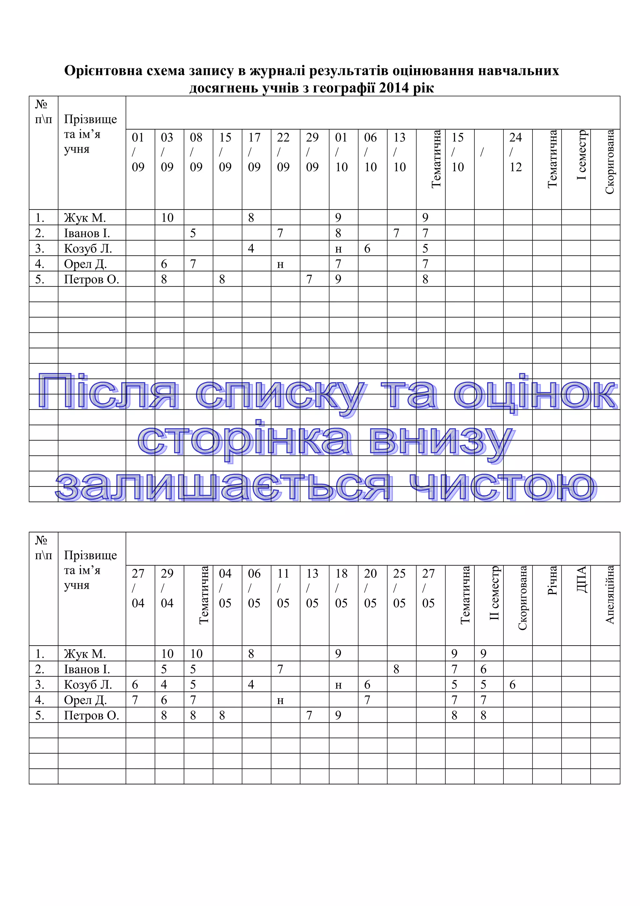 Орієнтовна схема записув журналі результатів оцінювання навчальних