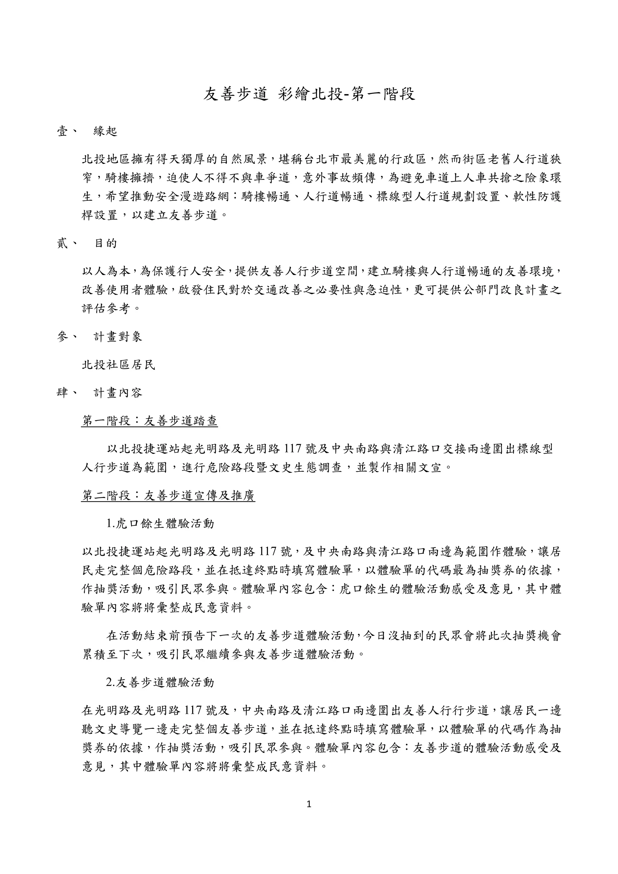 本計畫旨在改善北投地區的人行步道環境,以保障行人安全,促進友善步道的建立。計畫分為三個階段,包括步道踏查、居民體驗活動及座談會,並將收集的資訊彙整後提交給市政府進行改善。經費預估為100,000元,目標是在多個關鍵路段設置標線型人行步道及相關設施,提升居民與遊客的行走安全。