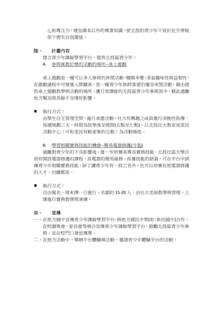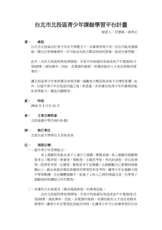 台北市北投區青少年課餘學習平台計畫旨在幫助青少年遠離不良嗜好,提升思辨能力及培養電器維修專業技能。計畫針對12至15歲的國中學生,提供桌上遊戲和簡易電器修復的學習機會,并鼓勵他們參與地方活動以回饋社區。預算總計為100,000元,用於購置桌上遊戲、修復工具、講師費及宣傳費。