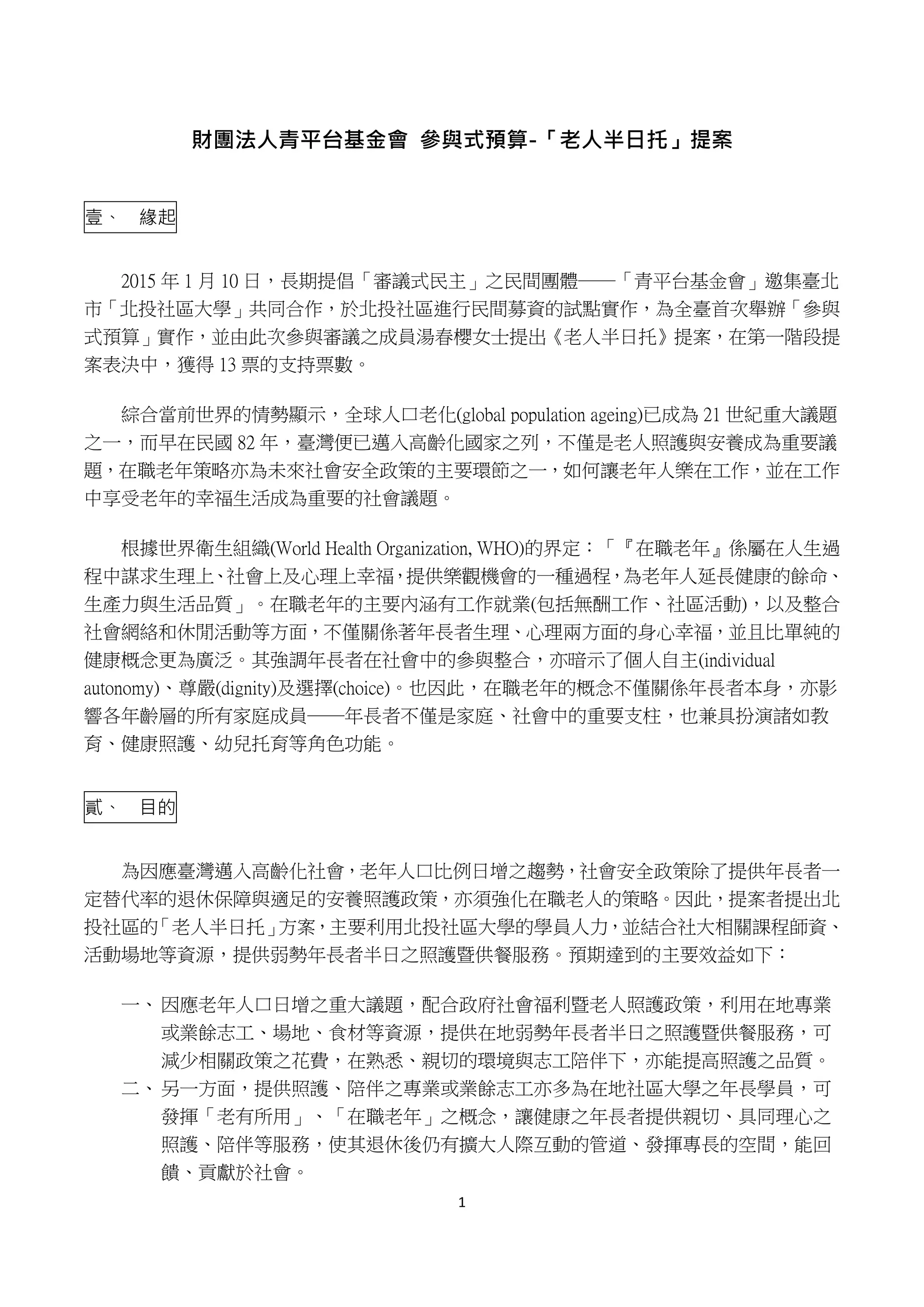 本提案由青平台基金會與北投社區大學合作,旨在針對高齡化社會提供「老人半日托」服務,滿足弱勢年長者的照護需求。該方案結合社區志工和在地資源,不僅提高了照護品質,還促進了年長者的社會參與和自我價值。在執行過程中,計劃將利用新鮮的本地食材,確保健康和安全,並強調社區支持的重要性。