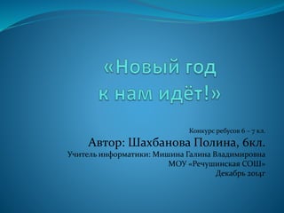 Документ описывает конкурс ребусов для учеников 6–7 классов, организованный Полиной Шахбановой с участием учителя информатики Галины Мишиной. В нём перечислены различные зимние и новогодние атрибуты, такие как ёлка, снегурочка и санки. Также указаны ссылки на изображения, которые могут быть использованы в конкурсе.