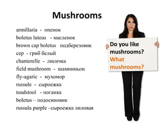 Документ представляет собой конкурсную работу на тему методической разработки по обучению английскому языку в 8-9 классах, автором которой является Елена Александровна Дегтярева. В работе содержится лексика, связанная с грибами и растениями, а также упражнения для практики перевода и понимания. Основное внимание уделено обогащению словарного запаса учащихся через тематические упражнения.